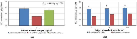 The dependence of NO emissions of Artemisia dubia Wall., Miscanthus×giganteus and Cannabis sativa L. not fertilized (a), on mineral nitrogen fertilization (b) (R0.05(A. dubia) = 0.179 g kg−1 DM, R0.05(M. giganteus) = 0.034 g kg−1 DM, R0.05(A. dubia × M. giganteus) = 0.102 g kg−1 DM. a, there are no statistically significant differences (p < 0.05) between the columns marked with the same letter, as assessed using the least significant difference.