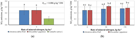 The dependence of SO2 emissions of Artemisia dubia Wall., Miscanthus×giganteus and Cannabis sativa L. not fertilized (a), on mineral nitrogen fertilization (b) (R0.05(A. dubia) = 0.104 g kg−1 DM, R0.05(M. giganteus) = 0.074 g kg−1 DM, R0.05(A. dubia × M. giganteus) = 0.071 g kg−1 DM. a, there are no statistically significant differences (p < 0.05) between the columns marked with the same letter, as assessed using the least significant difference.
