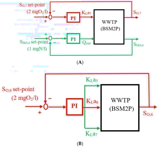 In this approach, a close-loop control framework contains a single PI controller as shown in Figure 3B. According to this scheme, SO in the sixth tank is maintained at a set-point of 2 mgO2/l by regulating the KLa6. In addition, the oxygen mass transfer coefficients entering tank 5 and tank 7 are multiplied by a factor of 1 and 0.5, respectively, to have improved manipulation and thus efficient aeration in these tanks [30].