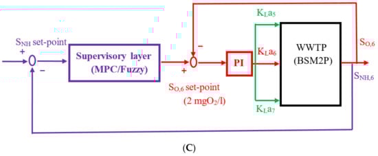 In this approach, cascade configuration, as shown in Figure 3C, is used, in which MPC/Fuzzy controllers for ammonia (SNH,6) control are used by manipulating SO,6 set point in the aeration tank 6. Here, SO,6 in aeration tank 6 is controlled by regulating the airflow rates of reactors 5, 6, and 7 as implemented in strategy 2. PI controller is designed at the lower level with combinations of fuzzy and MPC at the supervisory level. PI-MPC and PI-fuzzy combinations are proposed as overall control structures. The corresponding list of all four different control approaches is listed in Table 4.