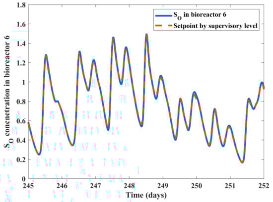 Based on this model, MPC is designed with a sampling time of control as 0.05 days (72 min); prediction and control horizons of 10 and 2, respectively; and rate of change of regulated variable as 0.1. The corresponding results are given in Figure 4 in which the computed values of SO by supervisory MPC controller and its tracking by the lower-layer controller for 245–252 days are shown. The performance evaluation was done in the period of 245–609 days. Figure 4 depicts that a good supervisory set-point tracking is achieved by using the PI-MPC controller design framework in the sixth bioreactor. The resultant average concentrations of nutrient removal, energy usages, and greenhouse gas emissions, and performance of the plant with cost assessment are reported in Section 4.4 and compared with the other three control frameworks.