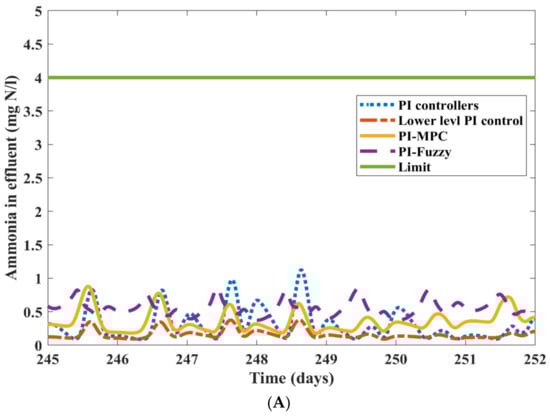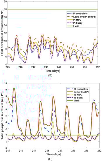 Nitrification oxidizes ammonium to nitrate, and denitrification reduces nitrate to nitrogen gas. Then a high DO improves nitrification, but an excess of nitrate perhaps is not fully denitrified in the anoxic reactors due to a lack of COD. Moreover, phosphorous removal is largely influenced by dissolved oxygen, which is directly proportional to the formation of orthophosphates. The effluent concentrations of ammonia, TN, TP, and TSS are compared for all four control frameworks with their corresponding pollutant limit value. These are depicted in Figure 6A–D.