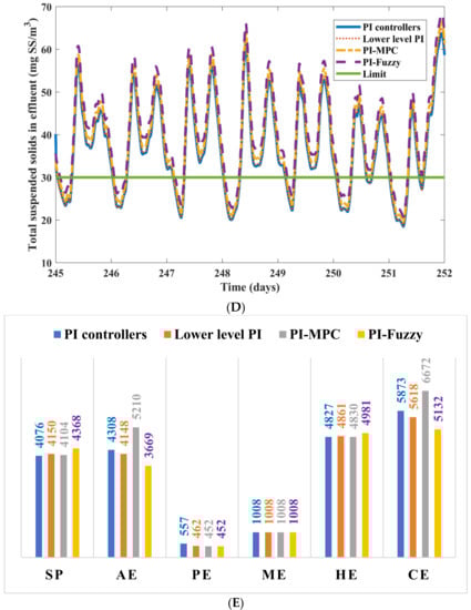 Figure 6E depicts the average values of energy usages like aeration, pumping, mixing, heating, consumed energies (kwh/d), and sludge production rate (kg ss/d). From the graph, it was observed that energy consumption was high in the case of PI-MPC and low in the case of the PI-fuzzy controller. The sludge production rate and heat energy are high with the PI-fuzzy controller. In comparison, the fuzzy controller shows less aeration energy to obtain better nutrient removal with a slight increase in the cost. In the literature, also it was showed that the fuzzy control is favorable for better removal of phosphorous. In comparison, PI (one loop) and PI-fuzzy showed an improved EQI of 21.1% with a 0.52% increase in OCI. In the comparison of all four control strategies, there is a trade-off between OCI and EQI. Overall, in comparison with the PI (one loop) controller, ammonia removal is improved with PI-MPC, and TP is improved with PI-fuzzy strategies. In both cases, PI-MPC and PI-fuzzy showed improved EQI with an increase of OCI. The corresponding greenhouse gases like methane, hydrogen, and carbon dioxides of averages production rates are also reported in Table 6. It is noticed that PI-fuzzy shows high methane, hydrogen, carbon dioxide, and gas flow production rates of 28.7%, 4.87%, 6.8%, and 3.2% in comparison with PI (one loop). PI-fuzzy and PI-MPC showed good improvement in minimizing the percentage of violations in TP and ammonia. The percentage of violations is also reported in Table 6. PI-fuzzy showed good removal efficiency in the phosphorus. Moreover, PI-fuzzy showed lower OCI when compared with PI-MPC.