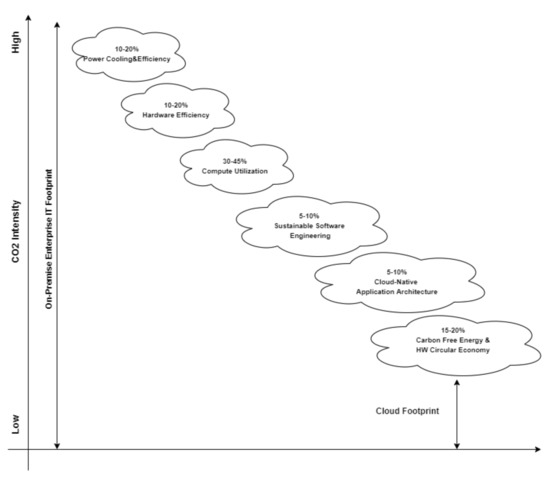 Overall, it is estimated that moving commonly used applications to the cloud would reduce energy consumption by 87% and the saved energy could be used to power Los Angeles for a year [36]. Similar analysis results are presented by Accenture, which shows that even partial migration to the cloud can reduce carbon dioxide emissions by over 84% compared to traditional infrastructure. The Accenture report shows that migrations to the public cloud can reduce CO2 emissions by 59 million tons per year which equates to taking 22 million cars off the road. However, the positive environmental effects of using a public cloud also depend on the supplier’s proper approach to reducing carbon dioxide emissions and having the necessary sustainability practices in, e.g., planning, building, powering, operating and decommissioning its data centers [37]. The proposals of various activities and possibilities of cloud computing to reduce carbon dioxide emissions in comparison to the organization’s own infrastructure are presented in Figure 2.