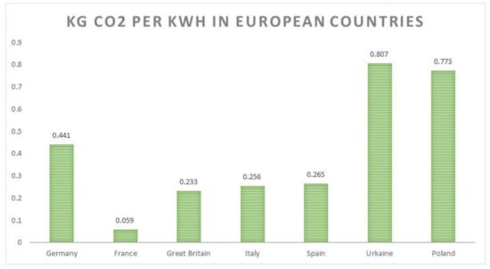 All the above calculations concern cities located on the territory of Poland. It is all the more important because Poland has one of the highest CO2 emission indices in Europe. Emissions in other countries are lower, but there are countries with a much bigger population and number of cities. European countries with a larger population than Poland include: Germany, France, Great Britain, Italy, Spain and Ukraine [49]. The relevant CO2 emission factors are presented in the graph—Figure 4.