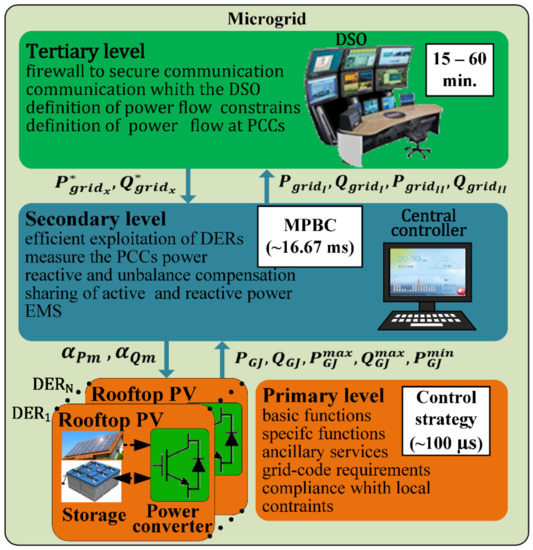 The hierarchical control architecture adopted is shown in Figure 2, and it is divided into three levels according to the updating frequency of the variables, dependence on communication and the imperative actions for proper operation of the µG. The primary level is the fastest one, running with processing frequencies of a few kHz, and being responsible for the local and autonomous control of DERs. This means that it is in charge of basic and specific functions to meet grid-code requirements, such as: voltage, current, frequency and synchronization control that are directly related to the stability of the power system, i.e., independent of communication [31]. As the primary level is well consolidated in the literature [32], it is not addressed herein.