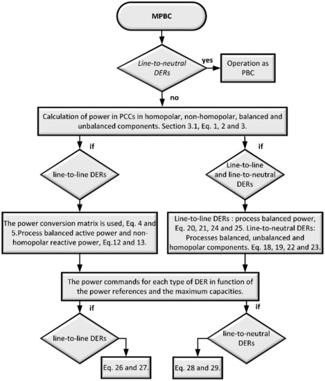 Finally, the greater degree of freedom of MPBC in comparison with PBC drives the system to: (i) reduced power losses; and (ii) faster dynamic response. In the following sections, terms with _ are vectors or matrices; and their elements are indexed with m or n for line-to-neutral quantities and mn for line-to-line quantities. Also, function stands for vector transformation to a square matrix filled with the vector elements in the diagonal and zeros otherwise. Figure 3 shows the flowchart with the sequence of execution of the proposed algorithm.