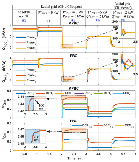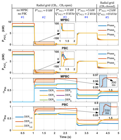 Figure 4 shows active power in the PCC1 and scalar coefficients for both algorithms. It is observed that the MPBC requires a shorter accommodation time in comparison with PBC to accomplish the active power references at the PCC. To quantify the accommodation time during power reference changes for both control algorithms, the coefficients in Figure 4 are used. MPBC needs 300 ms to achieve steady-state value corresponding to the portion of active power that DER2 must provide. Whereas PBC requires 550 ms, that corresponds to 83.3% of increase in time.