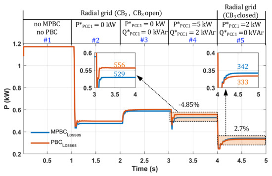 Individualized power flow control in both PCCs of the µG is achieved with the use of MPBC (Figure 7 and Figure 8). An important result (Figure 9) is identifying that the controlled PCC significantly affects the losses of µG, since for the same reference in both PCCs it obtained a reduction of almost 72.6% in the power losses when controlling power flow at the PCC1. Therefore, the power losses in LV µG with multiple PCCs is a parameter that can be used to define which PCC will be dispatched.