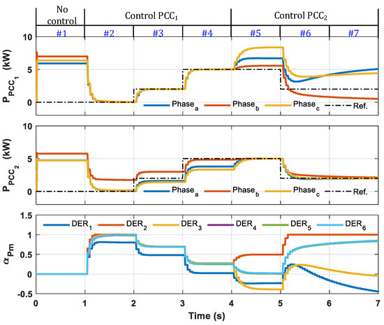 Figure 7 shows the active power in the PCCs and the scalar coefficients . The power reference is tracked in all scenarios. However, due to the random nature of the distribution of loads and DERs in the meshed µG, a greater effort by DERs is needed to control PCC2 when compared to PCC1. It is also observed that between the intervals #6 and #7 the scalar coefficients do not reach a steady state, a fact that is not observed in the intervals from #2 to #5 when the accommodation time of the coefficients is less than 0.5 s. Another important point is that even though the control is being carried out in one PCC at a time, due to the natural distribution of the energy flow in the µG, the PCC that is not being controlled assumes power values in a window close to the references applied in the PCC that is being controlled.