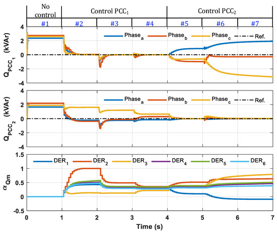 Figure 8 shows the reactive power in the PCCs and the respective scalar coefficients responsible for defining the reactive power contribution of each DER. Similarly, to the active power control, only between intervals #6 and #7 did the system not reach the references within the simulation window. Furthermore, there is the same increase in the accommodation time of the scalar coefficients, observed between intervals #6 and #7 in the active power control.