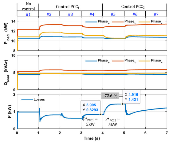 Figure 9 shows the profile of active and reactive power demanded by the load, in addition to showing the losses in µG. The variation in the voltage profile along the µG, due to changes in power references in the PCC causes a variation in the active and reactive demand in the µG. As for the losses, a highlight is that for the same references applied in both PCCs, the system presents a greater loss for all cases of control of the power flow in PCC2. In the specific case where the reference in the two PCCs is 5 kW, an increase of 72.6% of losses is observed to reach the same reference. In this sense, power losses become relevant information to define in which PCC the control will be carried out in µGs with multiple PCCs or even in µGC.