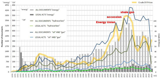 For a quantitative trend analysis, the advanced search functions of the EUR-LEX were used with the “all documents” setting and with the “legal acts” setting, respectively, for all searched words. The former includes all EU documents, the latter covers pieces of law exclusively. The text search function was applied for words “energy”, “hydrocarbon” and “oil” AND “gas”. The examined period is 1970–2020. This methodology was introduced and tested by Hámor et al. [3] on the EU scale.