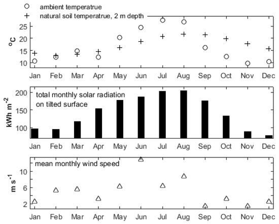 Monthly values for Athens (Greece) of the ambient temperature, natural soil temperature at 2 m depth, total solar irradiation on tilted surface with inclination 30° and azimuth of 0°, along with the mean monthly value of the wind velocity [31].