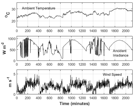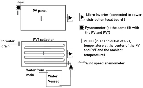 The sketch of the experimental array is illustrated in Figure 3. A small micro inverter was installed at each panel and both were connected to power distribution board. PT100s were used to measure the inlet and outlet temperature of the PVT, the PV’s and PVT’s temperature at the center of the panel (and the ambient temperature as well). The total incident irradiance on the PV and PVT was measured by a CMP 3 Kipp and Zonen pyranometer. Lastly, the wind velocity was measured by a cup-shaped anemometer at 0.1 m above the PV and PVT array. The flow rate was fixed at 0.031 kg s−1 throughout the experimentation. The experimentation day period was set from 10:00 to 17:00, and measurements were logged with 2 min intervals. Measurements were collected and stored by a personal computer from 1/05/2017 to 10/06/2017. The uncertainty of the monitored equipment is listed in Table 2.