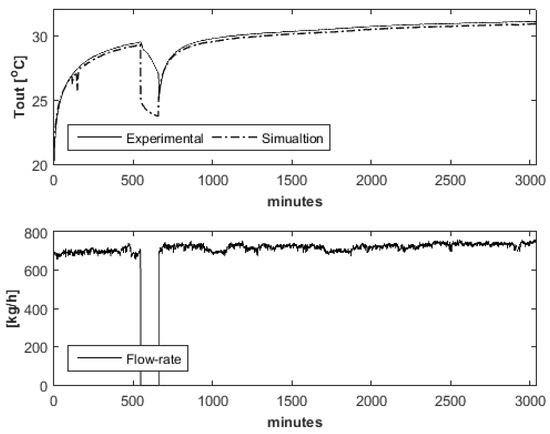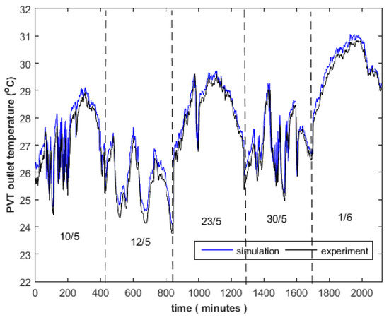 PVT’s outlet temperature, model prediction against data. For the total of five days (from 10:00 to 17:00). The flowrate was fixed to 111.6 kg h−1.