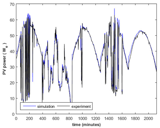 Power production of the PV, model prediction against experimental data. For the total of five days (from 10:00 to 17:00).