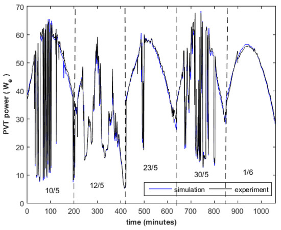Power production of the PVT, model prediction against data. For the total of five days (from 10:00 to 17:00). The flowrate was fixed to 111.6 kg h−1.