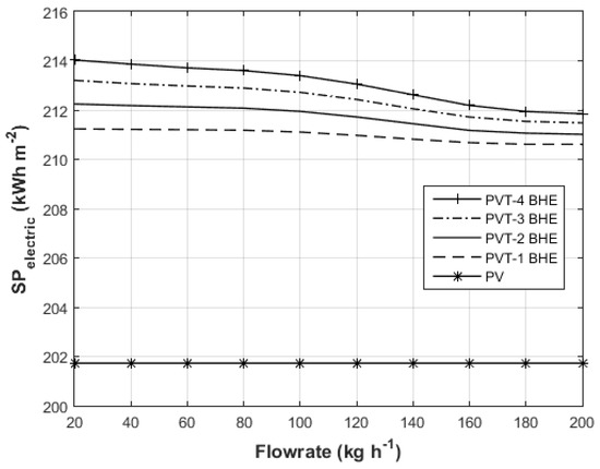The illustrated results of this section are estimated from a ten-year simulation period and by using hourly values of a typical meteorological year. The main climatic data of the TMY are shown in Figure 2. The first analysis is carried out by comparing 1 PV with 1 PVT paired with very shallow GHE (Figure 1). The comparison is conducted by varying the flowrate from 20 kg h−1 to 200 kg h−1 and the number of BHEs from one to four, the results are illustrated in Figure 9. As it can be seen, the PVT outperforms the PV in all of the scenarios. The specific productivity of the PV (SPPV_el) was estimated to be slightly less than 202 kWhe m−2 and this of the PVT (SPPVT_el) was varied from about 210.7 kWhe to 214 kWhe m−2 for the highest flowrate (200 kg h−1) with 1 BHEs to the lowest flowrate (20 kg h−1) with 4 BHEs, respectively. The SPPVT_el increases as the geothermal heat exchanger enlarges due to higher heat capacity of the soil. With high heat capacity (more soil mass) and for a given amount of thermal energy, the mean temperature of the soil will increase less than a smaller borefield (Table 5). With lower soil temperature, the solar heat is transferred more frequently, since the possibility to achieve a ΔT of 6 K between the PVTs and the soil is increased. Furthermore, the electric specific productivity of the PVT was found to drop as the flowrate increase. The higher flowrate causes lower PVT outlet temperature, thus the occasions to achieve the conditions for the solar heat to be transferred into the ground are reduced.