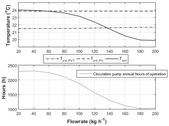 In Table 5 the percentage fractional improvement (FI) (Equation (1)) of one PVT collector against one PV is listed as function of the flowrate and the number of BHEs (Figure 1). The FI was found to increase as the flowrate rise, even though the electric specific productivity of the PVT found to drop accordingly. In details, the FI was found from 0.49 to 2.67%, for one BHE and four BHEs and with the lowest and the highest flowrate, respectively. The improvement of the FI with higher flowrates is due to the reduced electricity consumed by the circulation pump. The operation of the pump was constrained by the lower PVT outlet temperature, which consequently reduce the possibility for heat transfer from the collector into the ground. This can be explained via Figure 10, where the plate mean temperature of the PV, PVT, and the soil’s temperature are shown as function of the flowrate for the scenario of four BHEs. As it can be seen, the plate mean temperature of the PVT rises as the flowrate increases. This was caused by the less frequently used circulation pump. Thus, less heat was removed from the PVT, and consequently the efficiency of the PV-cells was reduced (Figure 1). It is worth noting that the soil’s temperature near BHEs was affected also by the pump’s reduced operation. As a result, the mean soil temperature near boreholes was found to drop from 24 °C to 20 °C for the scenarios of flowrates between 20 kg h−1 and 200 kg h−1, respectively. Also, the annual operation hours of the circulation pump were found to fall with similar trend as this of the soil temperature. The annual hours of the pump’s operation were found to be from about 2300 h to 1000 h for the lowest and the highest flowrate accordingly.