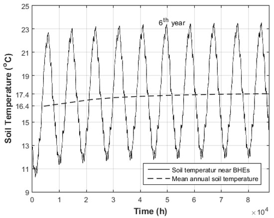 One of the remaining questions is whether the geothermal part of the proposed system remains stable during the period of analysis. In particular, if the temperature of the soil increases steadily and if the operation of the system is defected for this. For pure solar system one-year performance analysis is substantial to provide the overview regarding its energy performance, but this is not the case for systems with GHE. In Figure 11 the soil temperature near BHEs is shown for a 10-year simulation period and for a system of four PVTs (in series connected) with two BHEs (2 m deep and 2 m spacing). As it can be seen the mean soil temperature increase smoothly from 16.4 °C to 17.4 °C within the initial-period of six years, and after that transient period the mean temperature remains stable. Given that, the operation of the system is not influenced significantly, while the initial and steady state conditions of the soil can be considered during the design stage. Throughout the executed simulations of this study, the soil temperature illustrates this behavior, increases by 1 °C to 2 °C within the first six years of simulation and then remains stable.