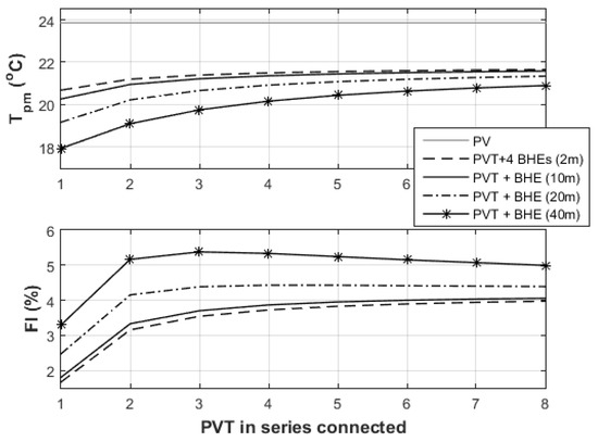 Figure 12 is printed with the aim to illustrate how the in-series hydraulic connection of the PVTs influence their energy performance (the outlet of the first is the inlet of the second and so on). Figure 12 shows the plate mean temperature of the PVT array as function of one string consisted of one to eight collectors in series (the illustrated value is the average out of all connected PVTs). The evaluation is made by considering four different types of geothermal heat exchangers, a borefield of 4 BHEs at 2 m depth and 2 m spacing, and a single BHE with three vertical lengths (10, 20, and 40 m). Along with the plate mean temperatures, the fractional improvement is illustrated for all simulation scenarios (Equation (1)). As it is expected, the plate mean temperature rises as the number of the in-series collectors increase and reach a plateau after a certain number of collectors. In details, for the borefield of four very shallow BHEs and for the BHE of 10 m depth the plate mean temperature stagnates at the fourth PVT, while for 20 m BHE the stagnation is achieved after the seventh PVT. The BHE of 40 m does not reach a plateau at any number of PVTs, and more collectors connected in-series are required for the stagnation. The BHEs of 40 m does not level the Tpm due to the larger soil mass adjacent to the borehole, which requires more PVTs in-series to stagnate. It is important to note that for the current analysis the in parallel connection of PVT is not evaluated, and the aim is to find out the influence of the in-series connection.