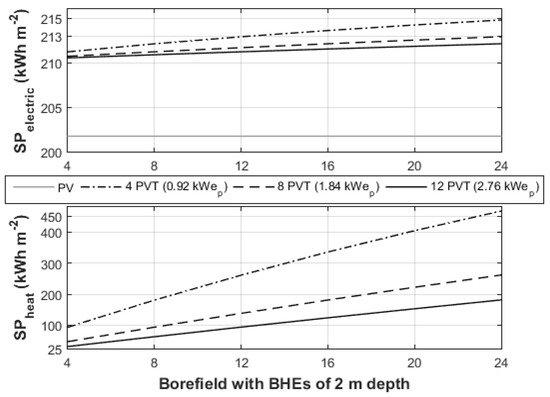 Electric specific productivity (SP) of one PV and of one PVT connected with one to four BHEs (four scenarios). All BHEs are in 2 m depth and with 2 m spacing.