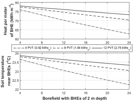The very shallow borefields with less than 2 m depth are in particular interest, since they can be built with a small drilling rig. This can improve the economy of the systems by reducing the costs correlated to the construction of the geothermal heat exchanger [44] and the construction time. With this particular interest, Figure 13 illustrates the electric and heat specific productivity for three PVT array sizes (4, 8, and 12 PVTs) and six borefield sizes (4, 8, 12, 16, 20, and 24 BHEs). Two distinctive trends are illustrated in Figure 13, the electric and heat SP increase as the borefield enlarges and reduce as the array enlarges. As the borefield enlarges more heat transfer area is available (BHEs) and more adjacent soil volume, and these increase the SP (heat and power). In contrast, as the PVT array enlarges more solar heat is transferred into the ground and that elevates the temperature of the soil (Figure 14). The higher soil temperature ends up to higher inlet temperature for the PVT array, and it is well known the electric and thermal efficiency of the collector reduce as the inlet temperature rises. It is pertinent to note that the produced heat is not used and is diffused naturally to the adjacent soil masses and surface. If the heat from the soil was remove in order to cover a heating load (industry, space heating etc.), the productivity of the system will improve due to the dropped soil temperature.