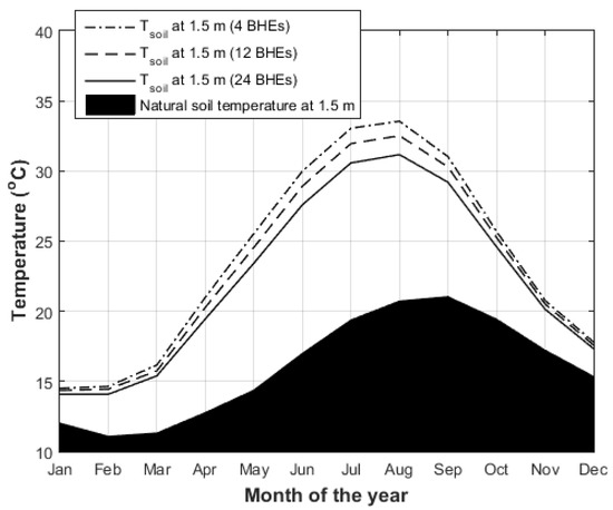 The annual variation of the soil near BHEs is shown in Figure 15 for the borefields of 4, 12, and 24 BHEs paired with 4 PVTs in contrast to the natural soil temperature (no system). All temperatures are illustrated at 1.5 m depth. All temperatures follow the same trend, which is lower values during winter months and the peak values during summer and especially on August. The natural soil temperature gets its maximum value one month later on September. It is worth noting that the soil temperature near BHEs is about 8–10 °C higher than the natural temperature during the season with the highest available solar energy (May to September, Figure 2). This temperature difference between the system made and the natural condition depicts the potential for further improvement of the systems energy performance. In other words, the lower the soil temperature near BHEs, the higher the electric SP. That highlights the need to remove the solar heat stored into the ground during the summer months in order to enhance the electrical energy generation.