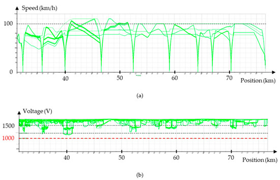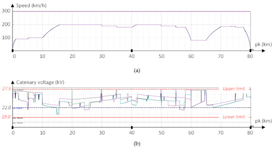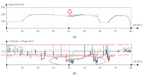 An important feature of ESMERALDA NG is that it accounts for the engine regulation mechanisms that prevent an excessive voltage drop along the catenary. At each step of time, if the catenary voltage of a train drops below a critical value, the power supplied to this train is limited in order to keep the catenary voltage within a range defined according to specific standards. Consequently, the speed of a train in this position would be smaller than expected. This situation means that the electrical network is overloaded and that one should either reinforce the electrical infrastructure (in a design and sizing study) or reschedule the traffic within the limits of the feeding network capacity (in an incident management study).