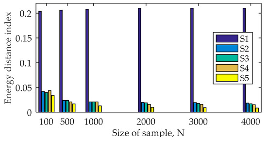 A fundamental property of energy distance is that are identically distributed [57]. This function can be expressed by the characteristic function (the inverse Fourier transformation of the density) [58,59]. The energy distance is independent of the shape of the distribution, and therefore accurately characterizes any type of distribution.