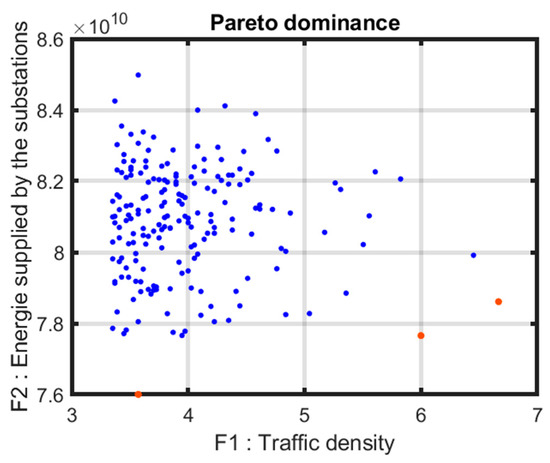 The present paper deals with disruption due to the failure of electrical equipment that limits the power available for the trains, and consequently affects the traffic in the area. While the literature on disturbance management is abundant (see for example [2,3,4,5]), less work has been published on disruption management. Most studies deal with the impact of the unavailability of one or several tracks during a certain time. In [6], the partial or complete blockage of a track is managed using three types of rescheduling action: delaying, cancelling, and reversing trains at the blockage. An integer programming formulation is proposed. The test case is a part of the Netherlands network and it is shown that delaying some trains can significantly reduce the number of cancelled trains. In [7], the outcome of short-turning management in the case of a complete blockage is considered. The paper considers short-turning time and short-turning before the blockage is introduced. Mixed integer linear programming is used to minimize a cost function with cancellation and arrival delay penalties. In [8], a mixed-integer linear programming model is also used, but in the case of the complete blockage of a high-speed line in China. Trains do not turn back and wait in a station. The issue is deciding in which station each train must wait, in which order trains must go when the blockage is over, and which trains should be cancelled. In [9], the authors consider the temporary blockage of a two-way track and choose to reschedule only the trains that conflict due to the blockage. Train cancellation is not considered and the test case remains rather simple. In [10], three objectives are considered: passenger satisfaction, the operational costs, and the deviation from the initial schedule. MILP optimization is performed with respect to the first objective, under the constraint of maximum values for the two others. A three-dimensional Pareto frontier is then built, and this demonstrates that a reasonable tradeoff between the three objectives can be reached. These examples of work do not constitute an exhaustive review and we refer the reader to [11,12] for in-depth surveys on train timetabling problems.