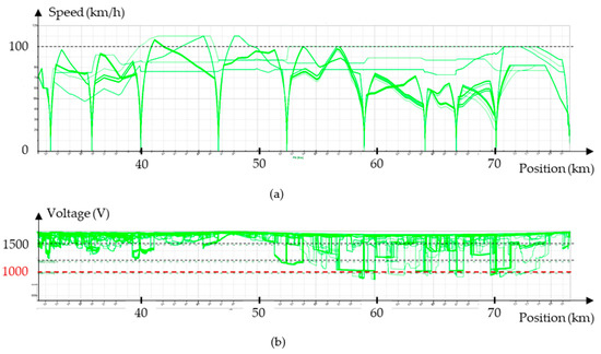 The adjustment model is a layer that encompasses the simulator (Figure 2). A pre-processing step consists of modifying the initial traffic data in accordance with the actions defined by the adjustment variables. Then, the simulation itself is run and the outputs of the adjustment model are directly the outputs of the simulator, of the shape , where is the number of time steps. The catenary voltages shown on Section 4 are examples of such dynamic outputs, with one voltage series per train. The simulator outputs are supplemented by post-processed performance criteria.
