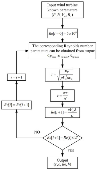 The iterative design process of the offshore wind turbine is shown in Figure 3. In design, only four parameters, namely rated power P of offshore wind turbine, number of blades N, inlet wind speed , and aspect ratio of offshore wind turbine , need to be known. In the literature [19], the wind energy capture rate curve corresponding to the Reynolds number of the initial test is selected first; then, the corresponding and when the wind power generator obtains the maximum wind energy capture rate are found. The radius, chord length, and Reynolds number of the wind power generator are calculated using Equations (2), (5), and (8), respectively. As the Reynolds number changes with the main size of the turbine rotor, the rotor diameter increases and the blade tip speed increases, resulting in the Reynolds number increasing. Therefore, the power coefficient of the offshore wind turbine generator is greatly affected, and it is necessary to calculate the Reynolds number and the Reynolds error of the initial test. If the calculation of the Reynolds number and the initial error using the power coefficient curve of Reynolds number requires one to draw a new Reynolds number or use a Reynolds number wind energy curve similar to the second iteration, ignore the Reynolds number effects on the performance of offshore wind turbine, if the error iteration of the offshore wind turbine parameters is designed for offshore wind turbines. Typically, the iterative design process takes only two or three iterations.