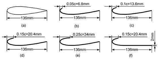 The influence of structural changes of J-shaped blades on offshore wind turbine performance. (a) the structural of J-shaped blades, (b) the structural (0.05c = 6.8 mm) of J-shaped blades, (c) the structural (0.01c = 13.6 mm) of J-shaped blades, (d) the structural (0.15c = 20.4 mm) of J-shaped blades, (e) the structural (0.25c = 34 mm) of J-shaped blades, (f) the structural (0.15c = 20.4 mm) of J-shaped blades.