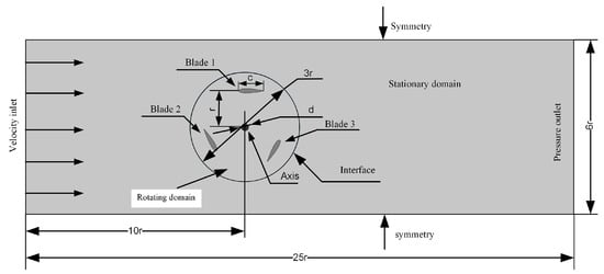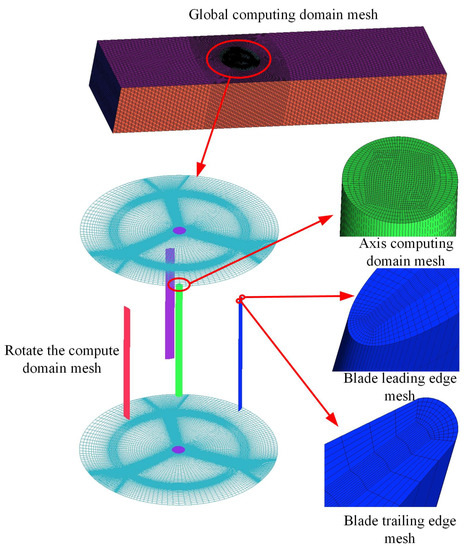 The selection of calculation domain parameters will affect the simulation results of offshore wind turbines [21,22]. When the outflow field of offshore wind turbine is simulated, the calculation field should be infinite. However, the calculation cost is considered in the actual simulation. Because the influence of the outflow field on the offshore wind turbine is reduced when it is far away from the offshore wind turbine, the influence on the performance of the offshore wind turbine can be ignored by selecting the appropriate size parameters of the calculation field. The whole simulation computing domain is a cuboid, and the wind generator is located near the entrance. It is composed of the stationary domain and the rotating domain, which is a multireference domain model. Although the sliding grid model can only carry out transient calculation and requires a lot of calculation time, the stationary and rotating domains interact with each other in the process of wind generator simulation, so the sliding grid model can better capture transient flows [7,23].