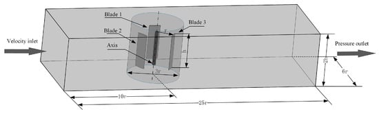 Figure 7 and Figure 8 are two-dimensional and three-dimensional computing domain models. In order to keep the wind speed flowing into the computing domain stable and prevent the wind speed change from affecting the flow field around the wind generator, a certain distance should be reserved from the wind generator entrance. Similarly, in order to observe the surrounding conditions of the wind generator and the wake conditions, and to consider the turbulence caused by the wind passing through the wind generator, the backflow outlet also needs to have a certain distance from the wind generator. We analyze the research on the division of the computing domain of offshore wind turbines. The computing domain dimensions are set as follows: the inlet boundary of the rotating main wheelbase of offshore wind turbines is , and the exit boundary is ; the diameter of the rotation domain is , where r is the rotation radius of the offshore wind turbine; the height of the blade and spindle of the offshore wind turbine is h, and the height of the calculation domain is .