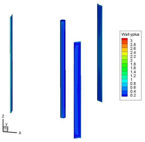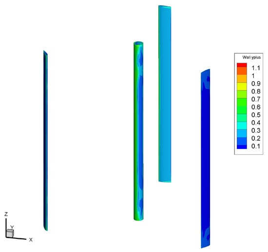 Since the size of affects the node position of the first layer mesh, a dense mesh is required for solving the viscous sublayer. Different turbulence models have different requirements for . k- turbulence model requires a value around 30, while k- turbulence model usually requires a value close to 1. In this study, the SST k- turbulence model is mainly used for simulation. As can be seen from Figure 11, the value on the spindle is closer to 1 and it is smaller at the blade. This is because the grid around the blade is denser with high linear velocity of the offshore wind turbine blade, and the maximum value of both the blade and the spindle is less than 1.2, which can meet the requirements of wall mesh.
