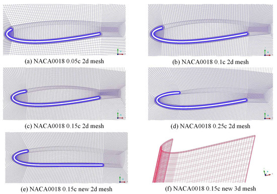 Figure 12 shows the 2D and 3D mesh of the J-blade wind generator. Due to the time limitation of simulation, only the optimized J-blade on the lower surface is simulated in 3D. Figure 12a–d shows the 2D mesh of the blade when the distance between the upper surface and the leading edge along the string direction is 0.05C, 0.1C, 0.15C, and 0.25C, respectively. In order to facilitate the mesh division of the structure and meet the mesh accuracy requirements, O-shaped blocks are used to divide the blade, and C blocks are used to divide the mesh behind the trailing edge. Figure 12e–f shows the 2D and 3D grids after optimization of the lower surface of the blade, respectively. The turbulence intensity at the top and bottom of the blade is relatively high, so the grids at the top and bottom of the blade are dense.