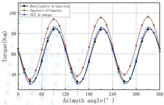 Figure 15 shows the simulation results of the three turbulence models at . It can be seen that the torque curve of the Spalart–Allmaras model is close to that of the k- and K- when it decreases and larger than that of the two-equation model when it rises. The similarity of k- and K- models has little influence on the simulation results of offshore wind turbines. Considering the characteristics of the above turbulence models, the SST k- turbulence model, which can better reflect the characteristics of the blade boundary layer, is adopted in this study.