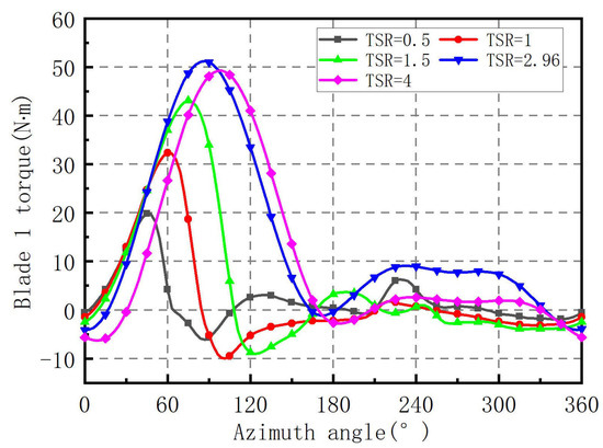 Because the offshore wind turbine blades only produce large torque upwind, and other blades in the downstream turbulent area rotation produce resistance, the offshore wind turbine startup performance is related to the initial azimuth and the overall torque of the blades. It can be seen from Figure 19 that with the increase of blade tip speed ratio, the range of negative torque decreases and the range of the azimuth angle with positive torque increases. TSR is selected with 0.5, 1, or 1.5. When the azimuth angle is between 0° and 180°, due to the low blade linear velocity, the blade is in a stall state most of the time, and the transient torque is relatively low, and even negative torque appears. When the azimuth angle is located at [180°,360°], the downwind blade torque is also relatively low due to the influence of upwind turbulence. When , the upwind torque reaches a large value when the azimuth angle is between 0° and 180°. When the azimuth angle is between 180° and 360°, the effective angle of attack range is relatively large and the positive torque increases first and then decreases, but the influence of wake flow is lower than the upwind torque. When , due to the increase of tip speed ratio and the azimuth angle near 0°, the wind generator is subjected to greater resistance, so the range of negative torque is larger at the beginning. When the azimuth is near 0°, the angle of attack is smaller, so the negative torque range is larger. When the azimuth angle is between 180° and 360°, the downwind wind field speed decreases with the increase of blade tip speed ratio, and the torque decreases due to the enhanced wake effect. As can be seen from Figure 20, with the increase of blade tip speed ratio, the range of effective angle of attack gradually increases, and the blade torque increases, reaching the maximum near . Then, due to the influence of stall and wake flow, the maximum torque gradually decreases.