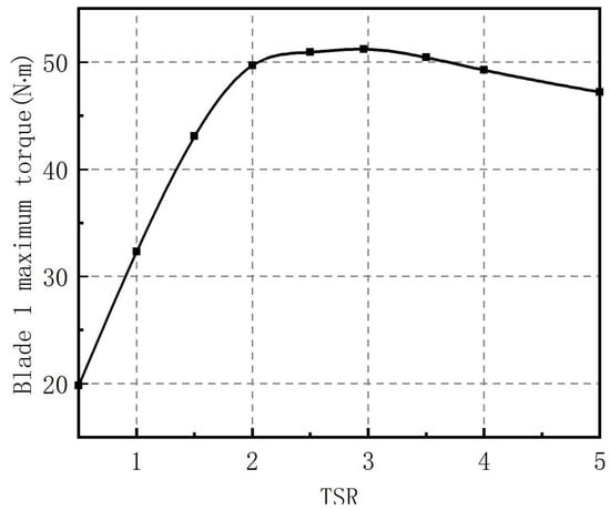 As can be seen from Figure 21, when the tip speed ratio is low, the range of effective angle of attack is relatively small, and the wind generator has instantaneous negative torque. At the same time, due to the larger stall torque fluctuation, the maximum torque of the wind generator gradually increases with the increase of the tip speed ratio, and the instantaneous negative torque gradually disappears. As can be seen from Figure 22, when , the average torque of the offshore wind turbine is about 5 N·m. With the increase of tip speed ratio, the average torque increases first and then decreases, and reaches the maximum value around . As the tip speed ratio increases, the downwind flow field speed decreases, so does the blade torque. Therefore, the average torque and the maximum blade torque of the wind generator increase as the tip speed ratio decreases.