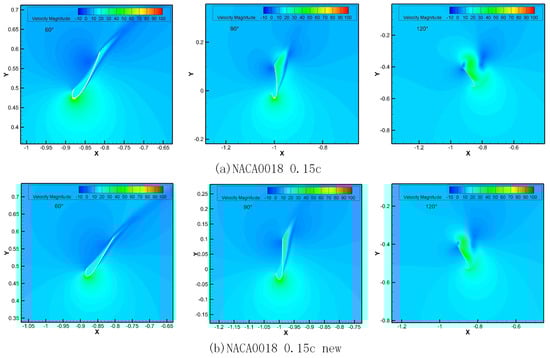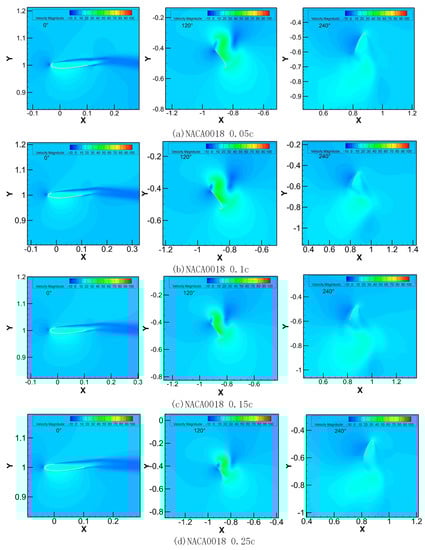 Since the change of the upper surface of the blade has little influence on the whole flow field, only the flow field around the blade is analyzed. The flow field around the J-shaped blade is selected with the azimuth angle of 0°, 120°, or 240°, which is shown in Figure 24. When the blade is at an azimuth angle of 0°, the direction of motion of the blade is opposite to the wind speed, and a flow field area similar to the blade linear velocity is formed in the middle of the J-shaped blade, and the farther from the leading edge, the larger the range of the middle area is. When the azimuth angle of the blade is 120°, the vortex is falling off on the lower surface of the blade, and the high-speed area in the middle of the blade is dispersed, and the farther away from the leading edge, the more the high-speed area is retained. When the azimuth angle is 240°, the notch area in the middle of the J-shaped blade is in the leeward side, and the mixed flow field of wind and wake acts on the lower surface of the blade. At this time, the shedding vortex is gradually formed in the middle of the high-speed flow field of the J-shaped blade due to blade rotation, and the instantaneous torque of the blade fluctuates under the influence of the shedding vortex.