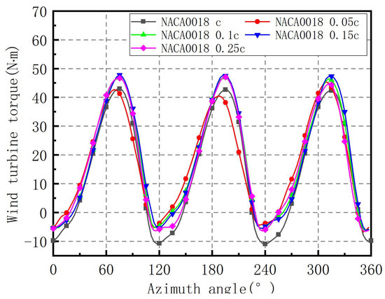 The instantaneous torque curve of the J-blade wind generator at is shown in Figure 27. It can be seen that the torque of the wind generator is in the trough when the azimuth angle is selected with 0°, 120° or 240°, and the negative torque (absolute value) is effectively reduced due to the torque effect provided by the J-shaped resistance, and the torque at the azimuth angle of the trough is improved. The torque of the offshore wind turbine is at the peak position when the azimuth angle is selected with 70°, 190°, or 310°. The torque of the J-blade offshore wind turbine is better than that of the symmetrical airfoil offshore wind turbine except that the instantaneous maximum torque of the NACA0018 0.05 C J-blade offshore wind turbine is poor. The above results show that the J-blade offshore wind turbine mainly raises the torque near the peak and trough of the wave, while the instantaneous torque rises and falls basically coincides with that of the symmetrical airfoil offshore wind turbine.
