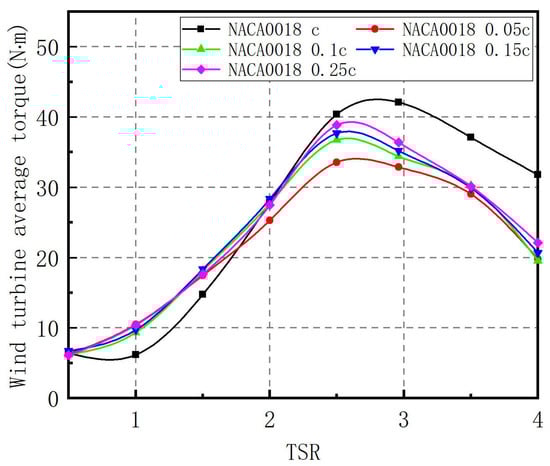 The average torque of wind generator with J-shaped blades varies with the azimuth as shown in Figure 28. When , the stall azimuth range of symmetrical airfoil wind generator is large, and the theoretical torque of wind generator is 0 when the azimuth angle is at 0° and 180°, but the actual torque is negative due to wake action. However, the J-blade offshore wind turbine is superior to the symmetrical airfoil offshore wind turbine because of its high torque obtained through resistance. When , the average torque of the offshore wind turbine first increases and then decreases. The average torque of the J-blade offshore wind turbine reaches the maximum near TSR = 2.6, while the average torque of the symmetrical airfoil reaches the maximum near TSR = 2.96. When the maximum torque of the J-blade offshore wind turbine is obtained, the corresponding tip velocity ratio is small. In addition, the farther the distance between the J-shaped blade and the leading edge along the chord length direction, the less the influence of eddy shedding on downwind offshore wind turbine torque, and the greater the maximum average torque near TSR = 2.5.