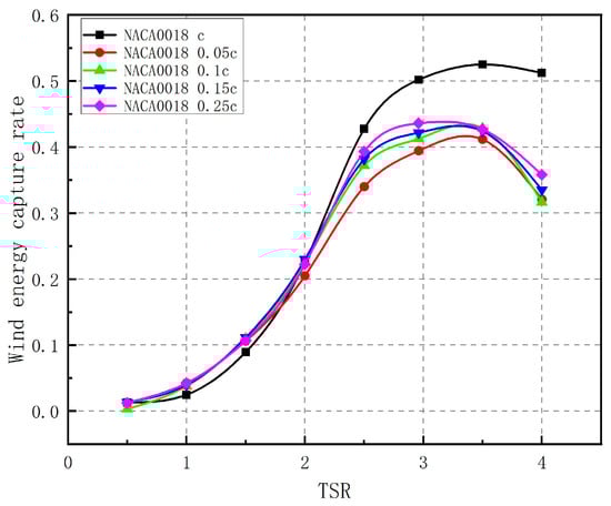 The change curve of wind energy capture rate with tip speed ratio of J-blade wind generator is shown in Figure 29. When , the wind energy capture rate of J-shaped blades is better than that of symmetrical airfoil offshore wind turbines. When , wind energy capture firstly increases and then decreases. J-blade offshore wind turbine and symmetrical airfoil offshore wind turbine have better wind energy utilization rate when and , respectively. In addition, the greater the distance between the upper surface and the leading edge along the chord length of the wind generator, the higher the wind energy utilization rate is when , but lower than that of the symmetrical airfoil wind generator. It can be seen that the change of the leading edge of J-shaped blade can improve the performance of the wind generator at low tip speed ratio, but the performance decreases at high tip speed ratio.