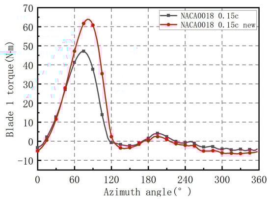 Figure 33 and Figure 34 show variation curves of instantaneous torque and average torque of J-blade wind generator before and after optimization. Figure 33 shows the wind generator’s instantaneous torque at . Since the torque of the wind generator is superposed by three blades with a difference of 120°, the optimized J-blade wind generator’s instantaneous torque increases greatly when the azimuth angles are selected in the intervals of [60°,120°], [180°,240°], or [300°,360°], corresponding to the azimuth angles of the blade’s instantaneous torque increase. It can be seen from Figure 34 that the average torque of the optimized wind generator increases when , but decreases rapidly as the blade tip speed ratio continues to increase.
