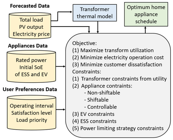 The proposed DR framework can be mathematically expressed as an optimization problem with various objectives and constraints, as shown in Figure 2. The optimization problem is formulated based on PV generation, asset degradation costs, electricity price, initial state of energy (SoE) of EVs, and ESSs’ batteries, together with the user preferences data. Each of these elements is described in detail in the below subsections.