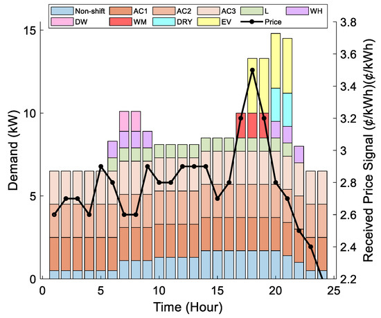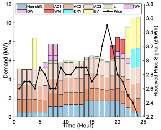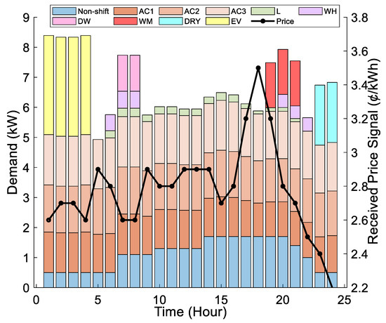 Also, it can be observed that appliances with larger consume more energy than the appliances with lower . This is to guarantee that the customer suffers less dissatisfaction with the proposed DR algorithm. For example, for the same electricity price, AC3 consumes more energy than AC2, and AC2 consumes more energy than AC1.