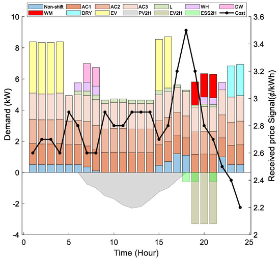 This case is considered as a reference in the study, which presents the household load profile before participating in the DR program. Figure 3 shows the aggregated energy consumption of all active and passive household loads, as well as the signal of energy cost. Based on the cost signal, the estimated energy consumption cost of the reference case is USD 6.1.